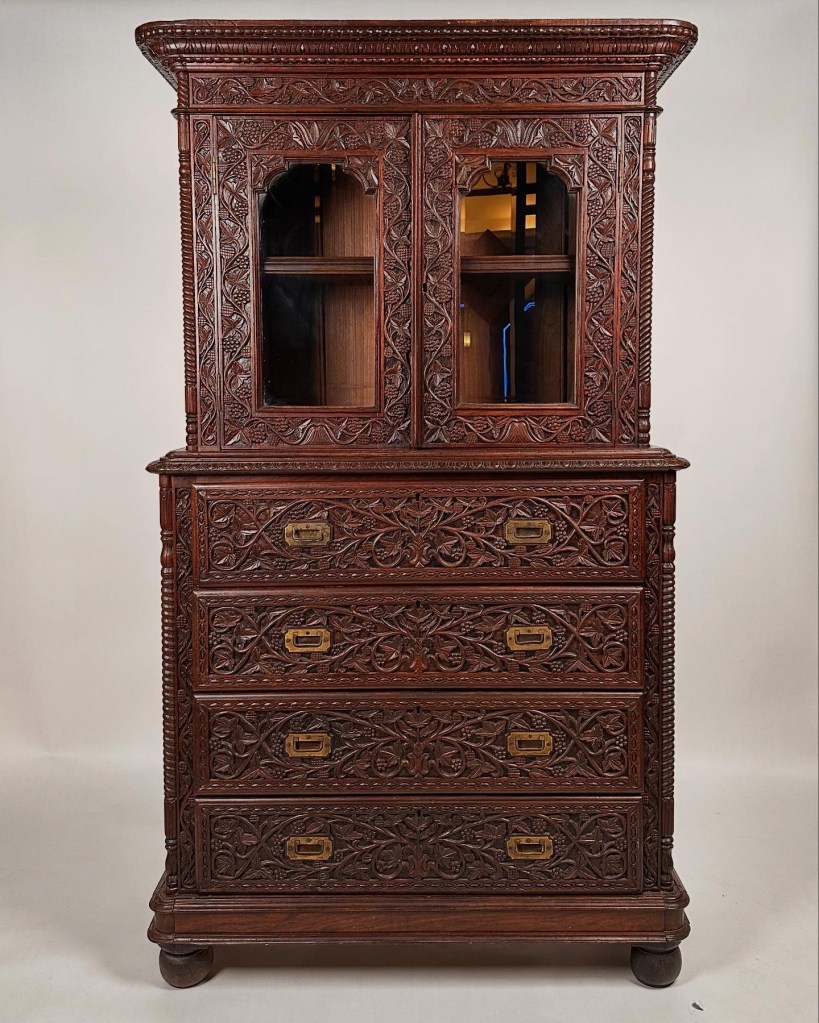 A piece that effortlessly balances ornamentation with function, this Anglo-Indian drop-front bureau, crafted in Calcutta between the 1880s and 1890s, is a masterful display of fine woodworking. Carved from deeply patinated rosewood, its surface is adorned with cascading ivy and grapevine motifs, rendered in high relief with exceptional precision. The overall form carries a Portuguese colonial influence, its gentle poised stance rests atop elegantly turned ball feet.