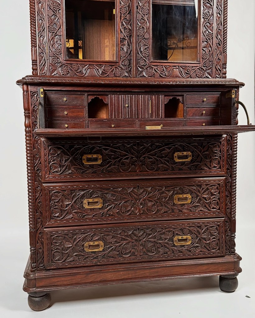 Once opened, the piece takes on an entirely new dimension. The drop-front drawer reveals a strikingly veined rosewood writing surface, its polished grain catching the light in a way that feels almost fluid. As the drawer lowers, it casts a shadow over the lower half of the bureau, allowing the carvings to stand out in dramatic contrast—every vine, leaf, and flourish suddenly appearing sharper, more pronounced.